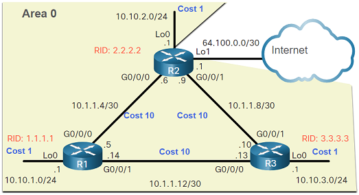 I den aktuella topologin har alla GigabitEthernet-portar en kostnad på 10 och loopback-interface en standardkostnad på 1. För att säkerställa att OSPF föredrar vägen via R2 ska följande ändringar göras: