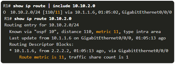 Routing-tabellen för R1 bekräftar att metric-värdet för att nå R2:s LAN är 11, vilket visar att beräkningen stämmer överens med OSPF:s sätt att fastställa den bästa vägen.