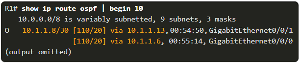 OSPF-kostnader kan manuellt justeras för att påverka vilken väg som väljs av OSPF. Detta är användbart för att styra trafikflödet och optimera nätverkets prestanda. I den aktuella konfigurationen utför R1 lastbalansering till nätverket 10.1.1.8/30 över två rutter. En del av nätverkstrafiken skickas via R2, medan den andra delen skickas via R3. Denna lastbalansering återspeglas i routing-tabellen, där båda vägarna har samma metric-värde och därför används samtidigt.